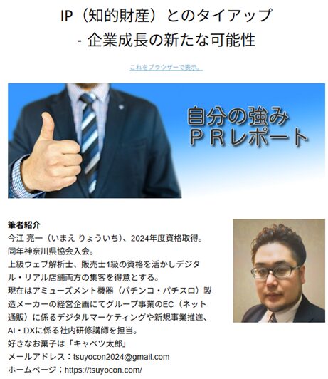 中小企業診断士としての実務経験をもとに、デジタル・リアル双方の販促施策におけるIP活用の考え方を整理した内容となっており、神奈川県内を中心とした中小企業の経営支援に役立つ視点を紹介しました。