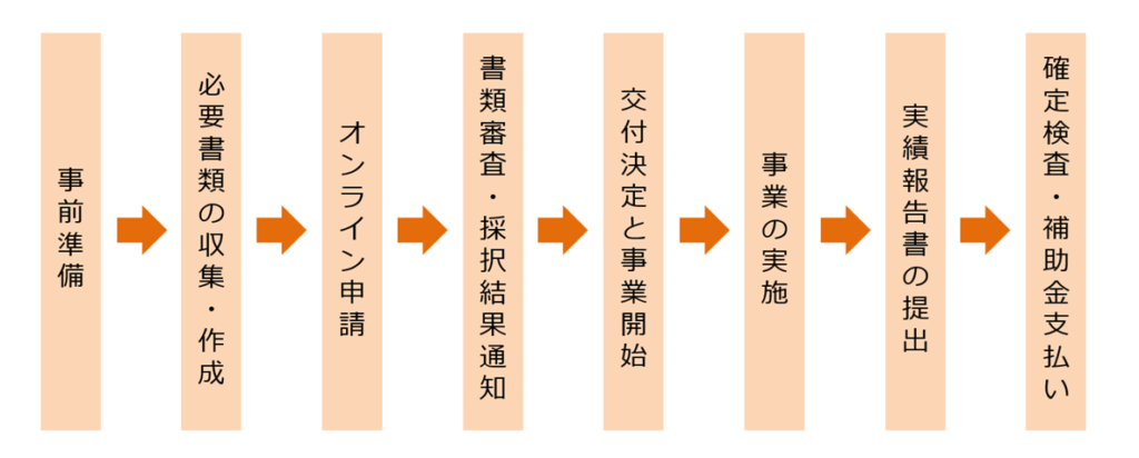 まず、必要書類を整備し、事業計画を立てて申請します。その後、審査を経て採択が決定されると交付決定通知が届きます。事業実施期間内に事業を行い、最終的に実績報告書を提出して確定検査を受ける必要があります。この一連の流れを踏まえ、丁寧に手続きを進めることが重要です。